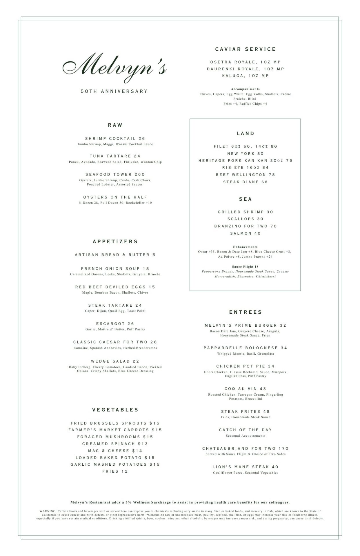 Melvyn’s Restaurant adds a 5% Wellness Surcharge to assist in providing health care benefits for our colleagues.